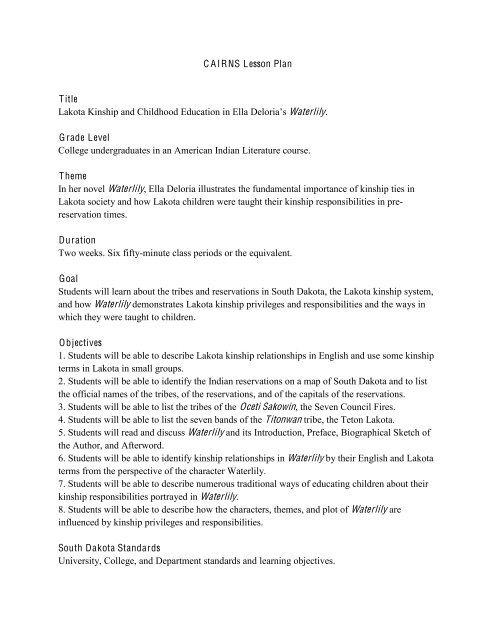 Cairns Lesson Plan Title Lakota Kinship And Childhood Education